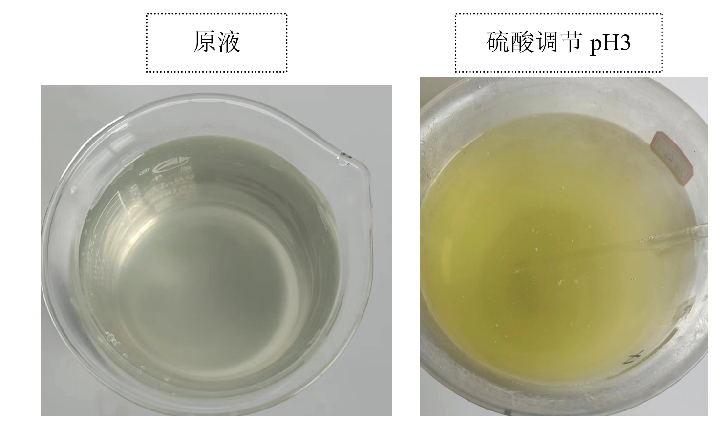 2、水样,多宝山铜业提供含钼溶液,呈微黄色澄清pH 10.1 ,钼含量 23.41g/L。用硫酸把水样pH调节到2.5~3,采用浓硫酸调节pH后黄色加深有少许浑浊,且调节pH过程中有大量气泡产生,分析是产生的二氧化碳。