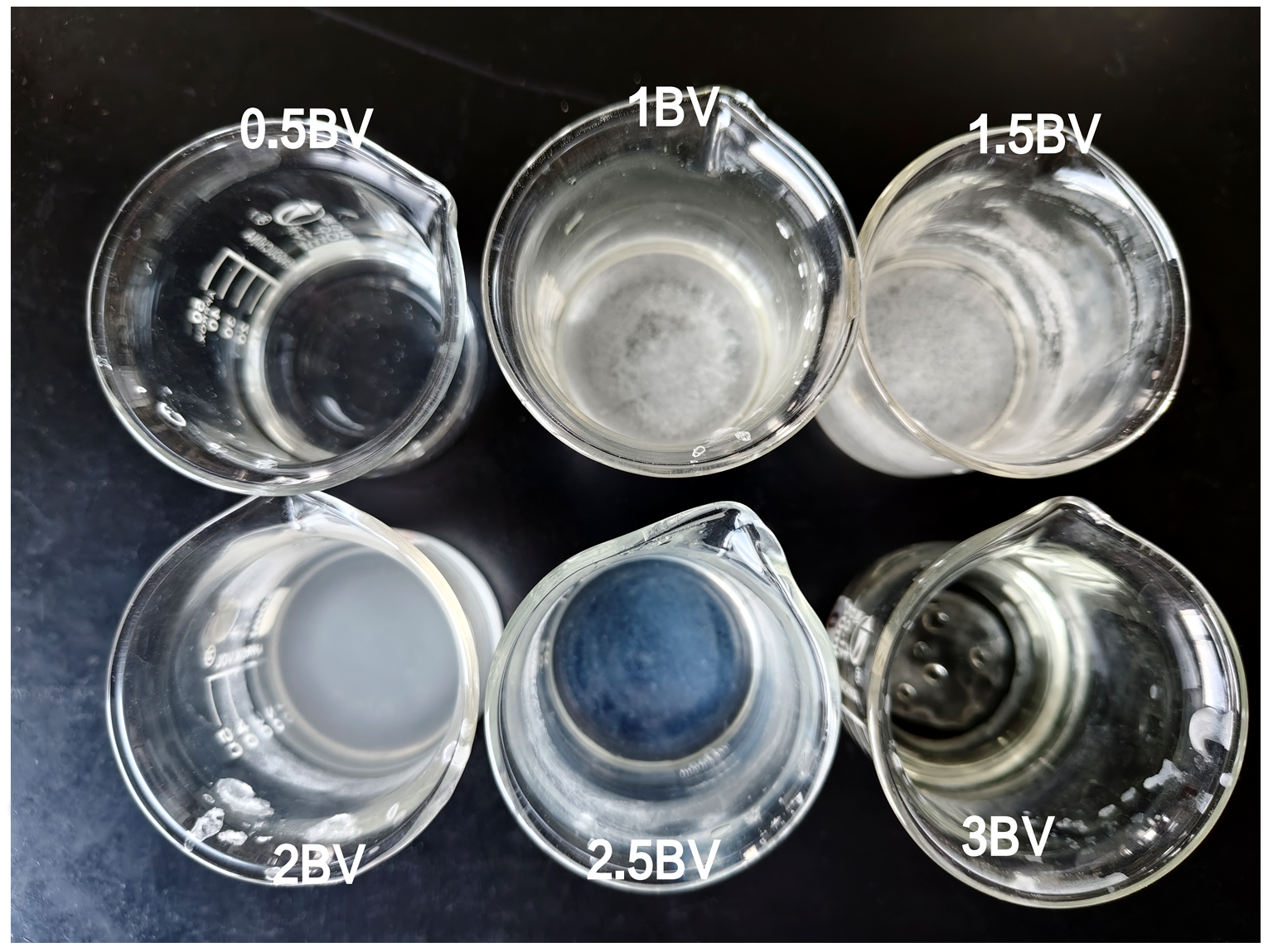 5、用2BV纯水以2BV/h流量从上向下通过树脂进行慢洗,每0.5BV洗脱液进行收集,检测钼含量。