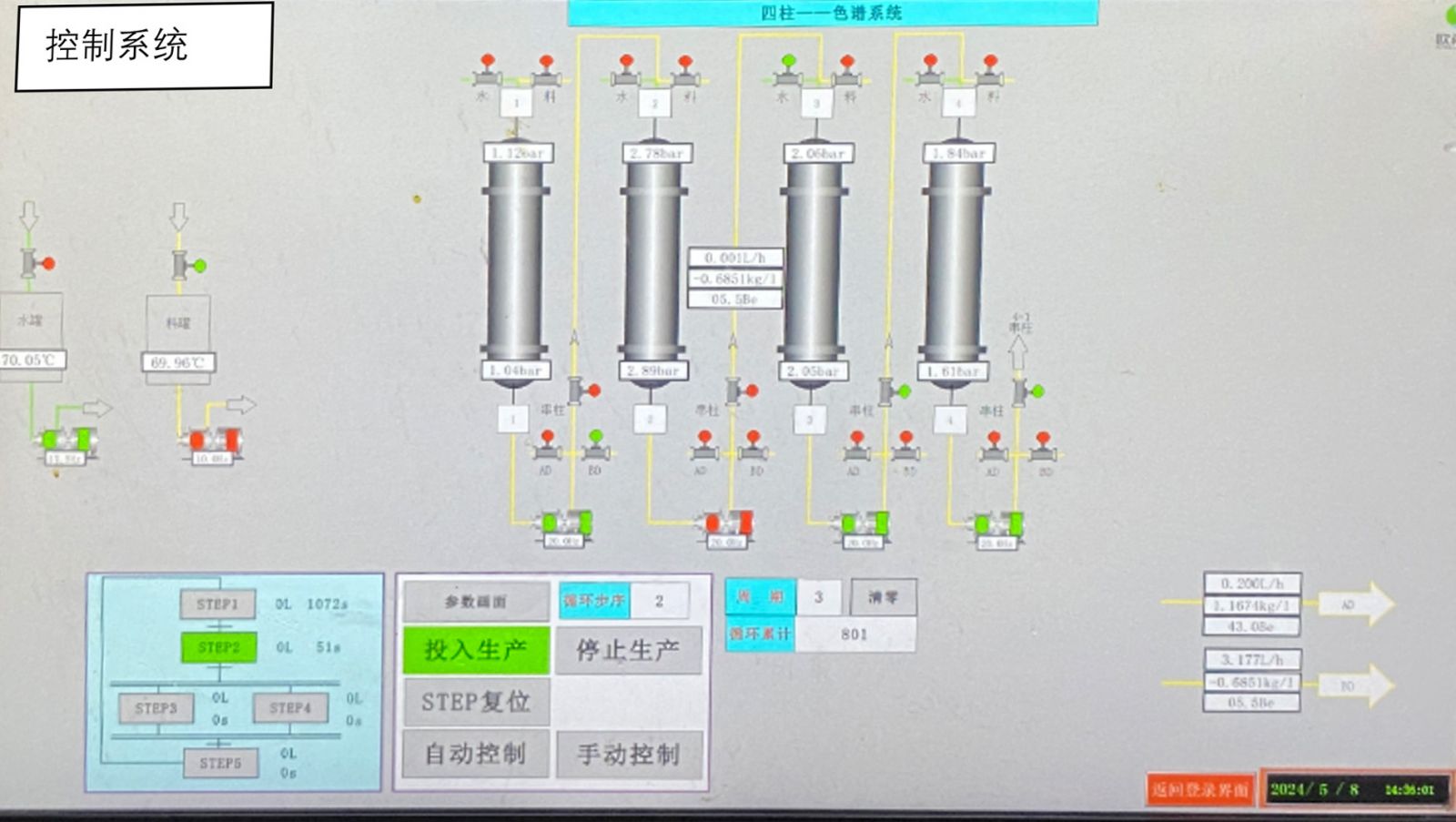 试验用色谱树脂为争光色谱分离树脂ZGSPC106Ca,实验设备为天津欧尚元中试色谱分离装置,试验装置于2024年4月29日投入运行。