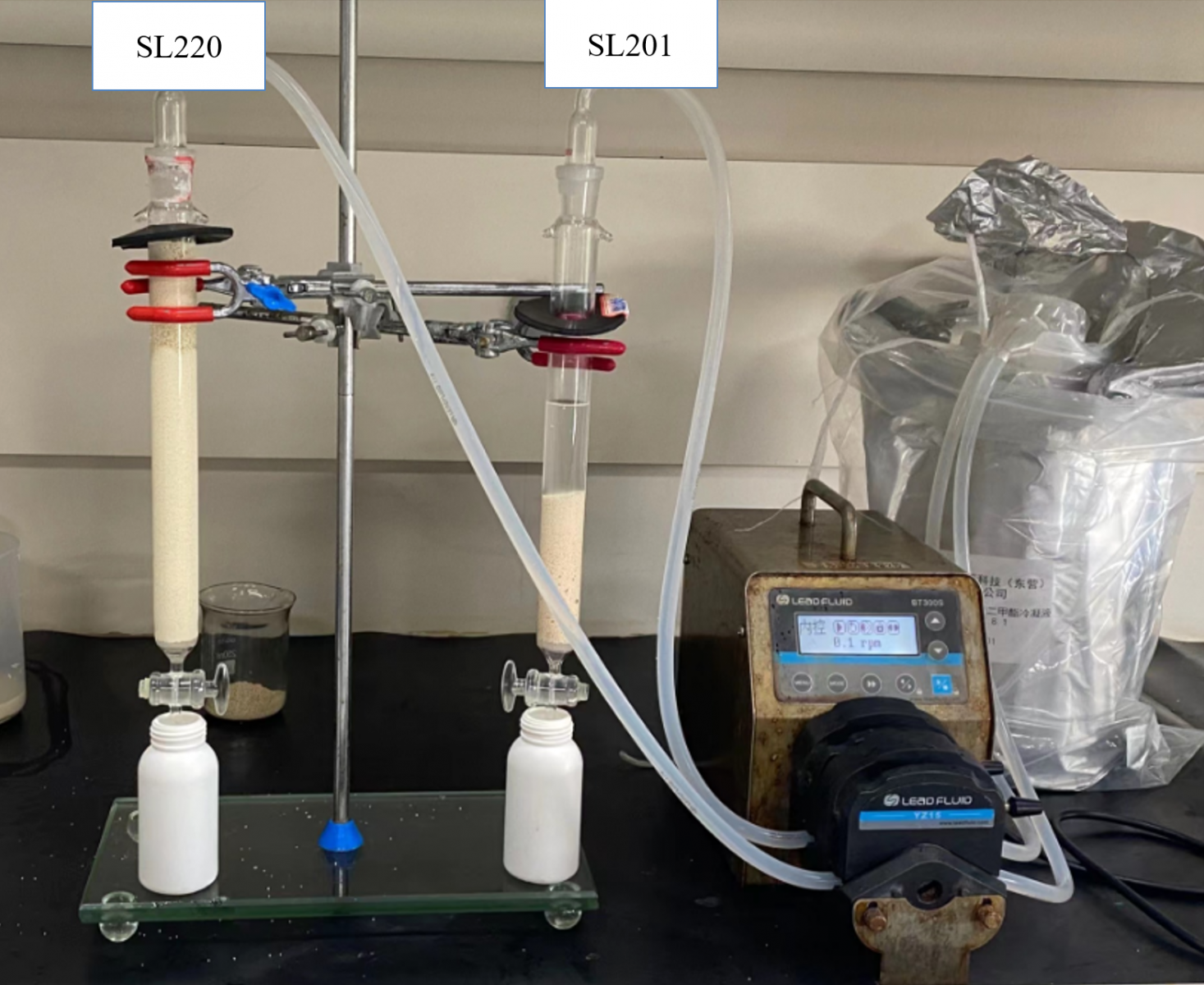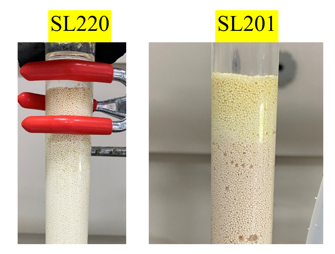 对山东某新材料集团DMC冷凝液(V9005A采样位置)进行脱水脱酸树脂选型,争光实验室无脱水装置实验条件,选择SL220和SL201干态阴树脂(含水量小于1%)仅进行脱酸处理的树脂选型。