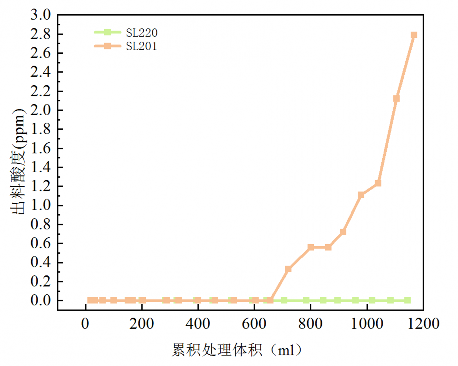 试验采用了争光SL220和SL201两款干态阴树脂对山东石大胜华DMC冷凝液(V9005A采样位置)进行脱酸试验,从吸附酸度曲线可以看出。