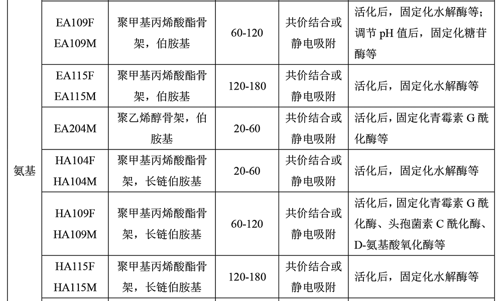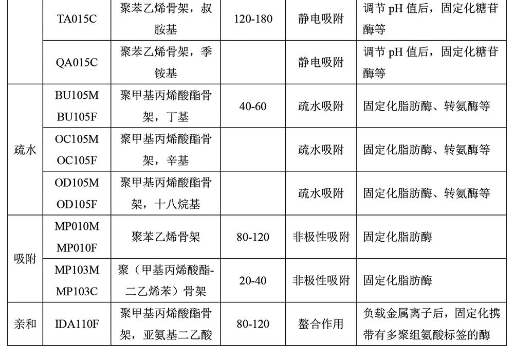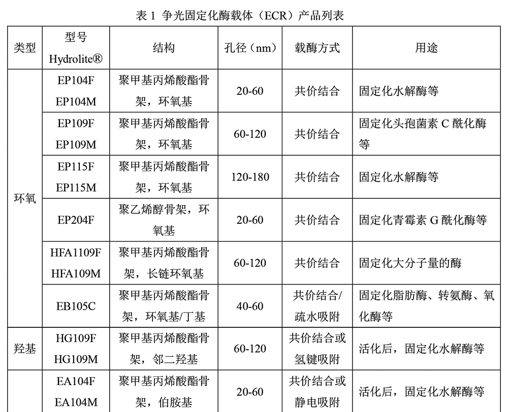 争光现已自主研发出具有多种骨架、孔结构和结合基团类型较为齐全的系列固定化酶载体,共有环氧、羟基、氨基、疏水、吸附和亲和共六大类、二十余个品种。固定化酶载体产品具有粒度均匀、结构可控、载酶活力高、批次稳定性好、机械强度优等特点,可固载多种生物酶,以满足不同行业领域、不同使用环境下的生产应用和科学研究等的固定化需求。
